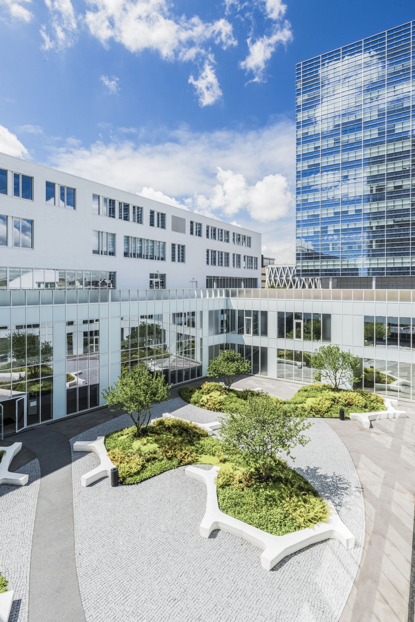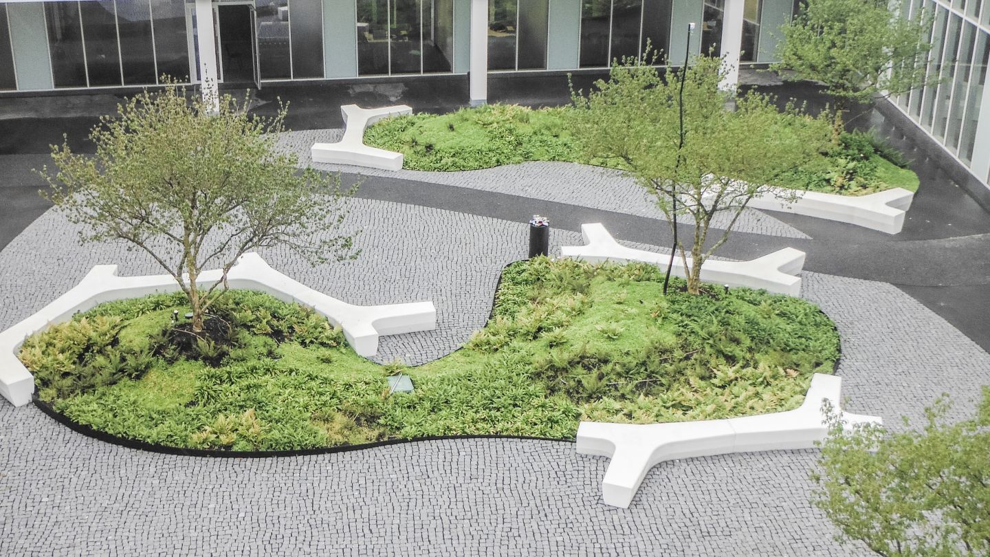 De patio van Campus Ellermanstraat is meer dan een daktuin. Hij werd opgevat als een centrale ruimte waarrond circulatie, ontmoeting en gemeenschappelijke functies worden gegroepeerd. De tuin wordt gedetailleerd en gecompartimenteerd met drie heuvels en opvallende architectonische witte banken. Grote, meerstammige en bloeiende Cornusstruiken maken van de patiotuin een herbergzame plek ten opzichte van de hogere omliggende bebouwing. Alle onderdelen samen zorgen voor ‘gastvrije’ plekken waarin studenten en docenten kunnen verpozen. De onderbeplanting is het jaarrond attractief en vergt een minimaal onderhoud.