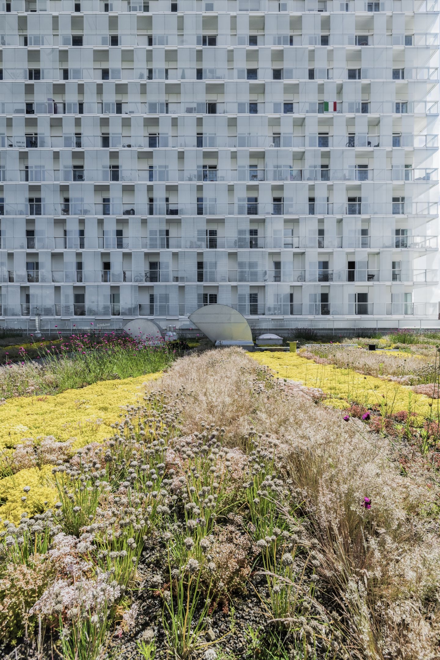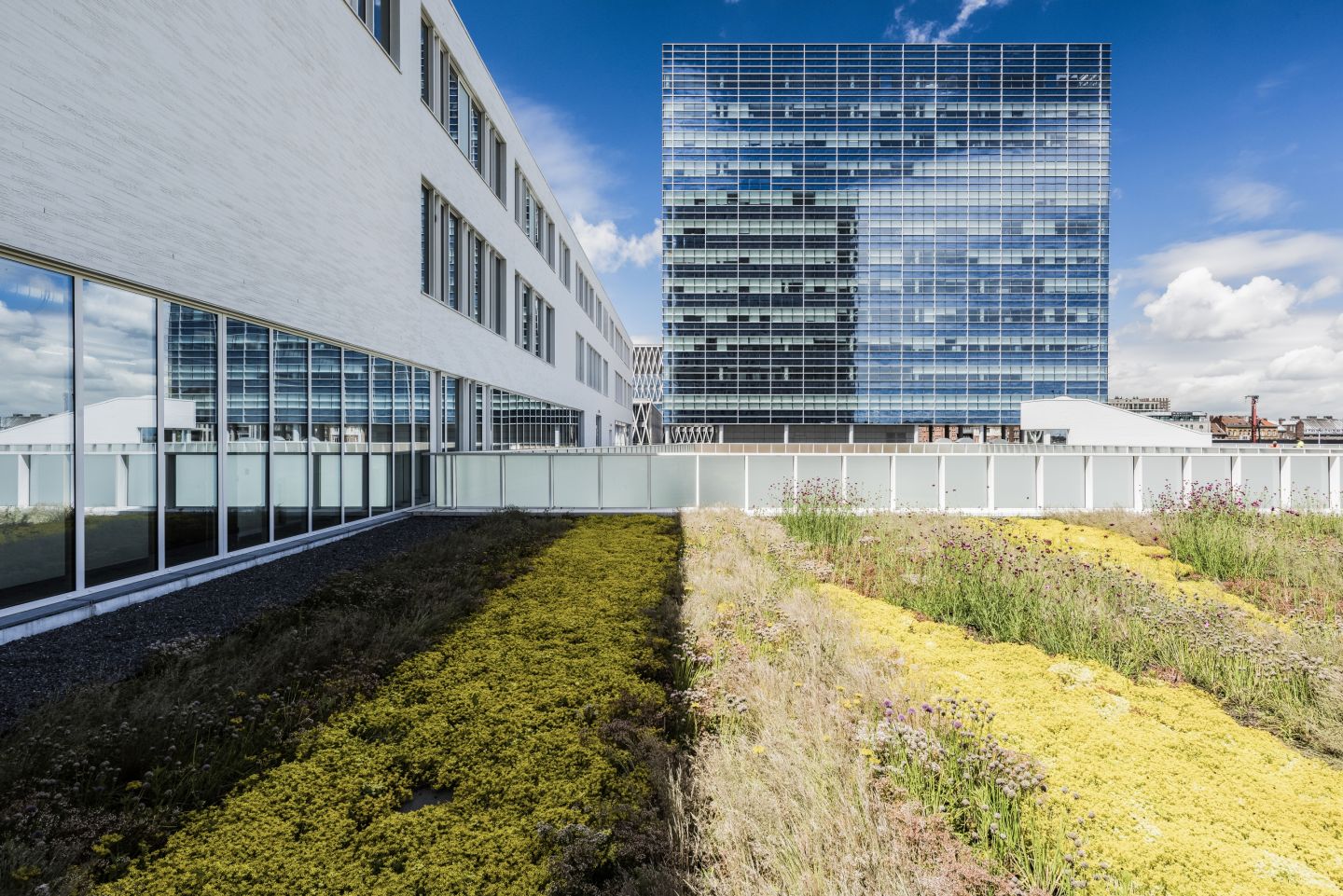 De daktuin is zichtbaar vanuit de omstaande gebouwen, verwijst naar het recente spoorverleden. Verschillende Sedumsoorten - eigen aan spoorwegbermen - worden in drie kleuren afwisselend in rechte ‘sporen’ aangeplant. Tussen deze lijnen zijn functionele paden aangelegd in ‘spoorgrind’. Om het weelderig karakter van het oude spooremplacement te benadrukken worden de Sedumsoorten aangevuld met siergrassen. Zij zorgen voor beweging op het dak.
