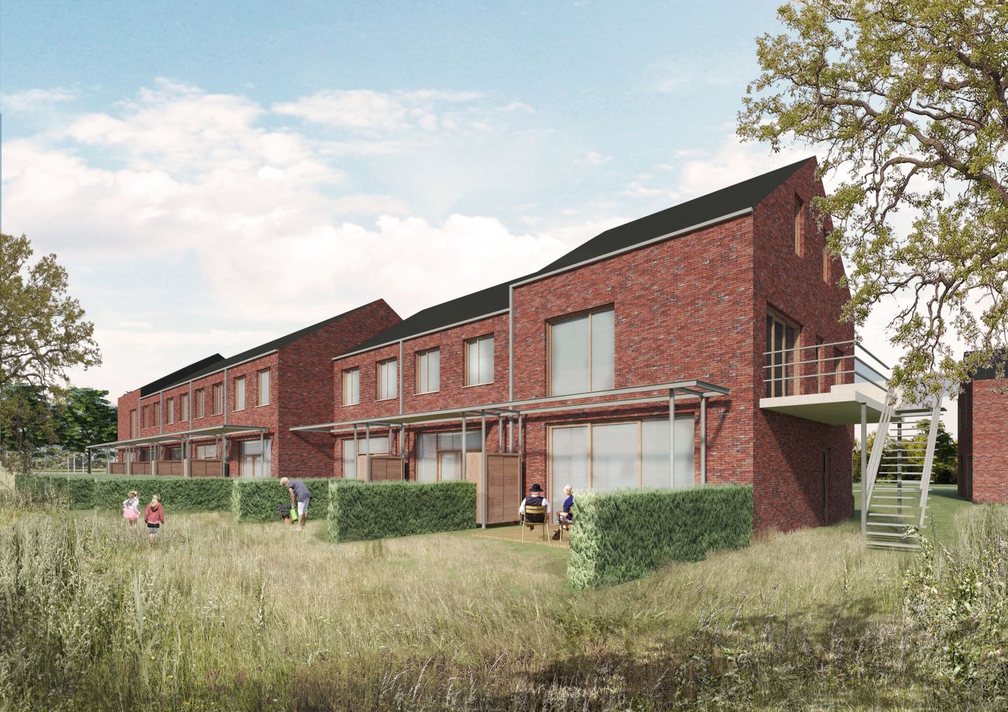 Door de woningen te groeperen en zoveel mogelijk naar de perceelsgrenzen te schuiven ontstaan voldoende grote private tuinen met optimale bezonning, maar ook een kwalitatieve, aaneengesloten, gemeenschappelijke buitenruimte. Dankzij clustering van de woningen in korte linten, blijft een zekere luchtigheid in het binnengebied behouden en zijn doorzichten naar de omgeving mogelijk. De woningclusters hebben - naar analogie met de omgeving - 2 bouwlagen met zadeldak.