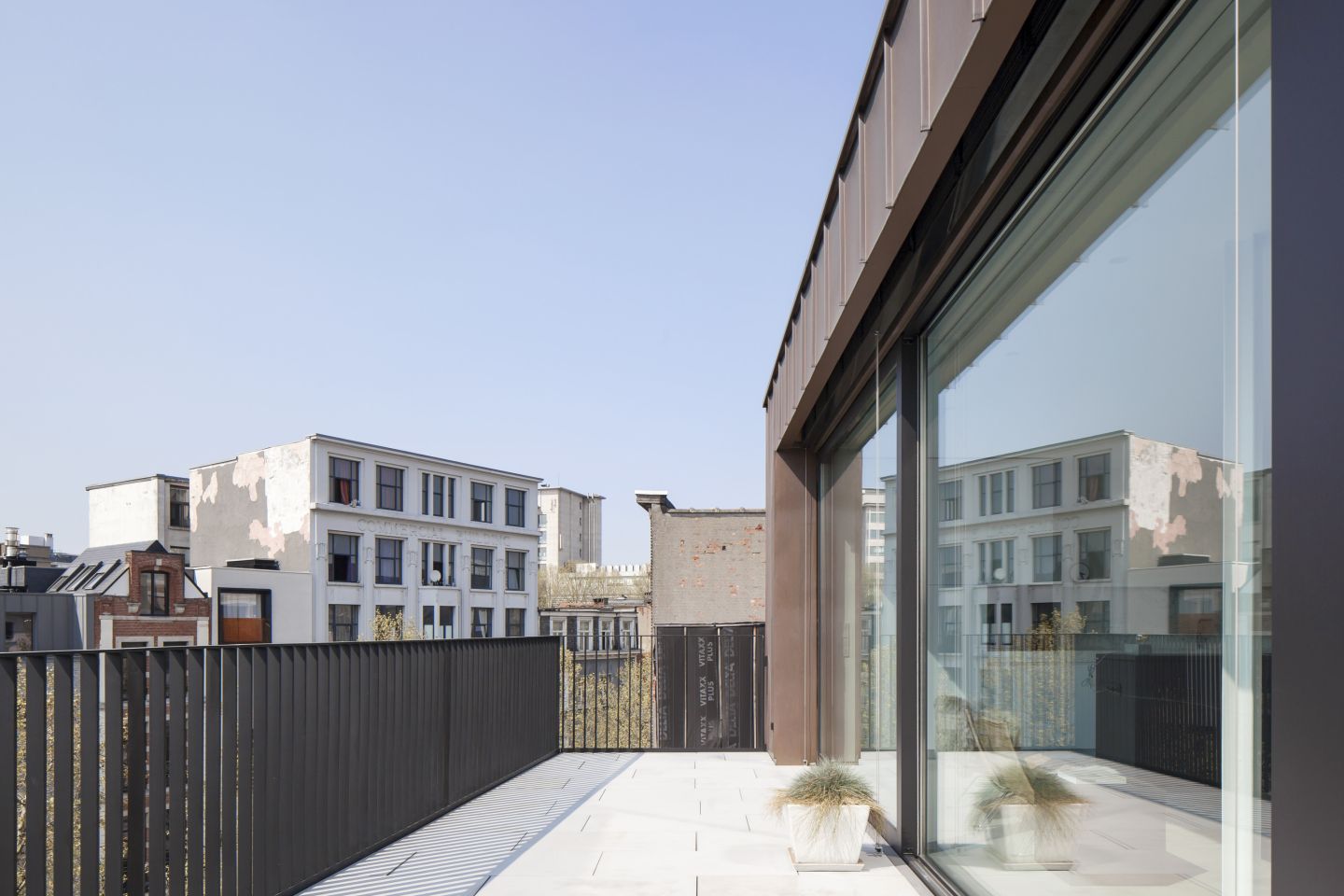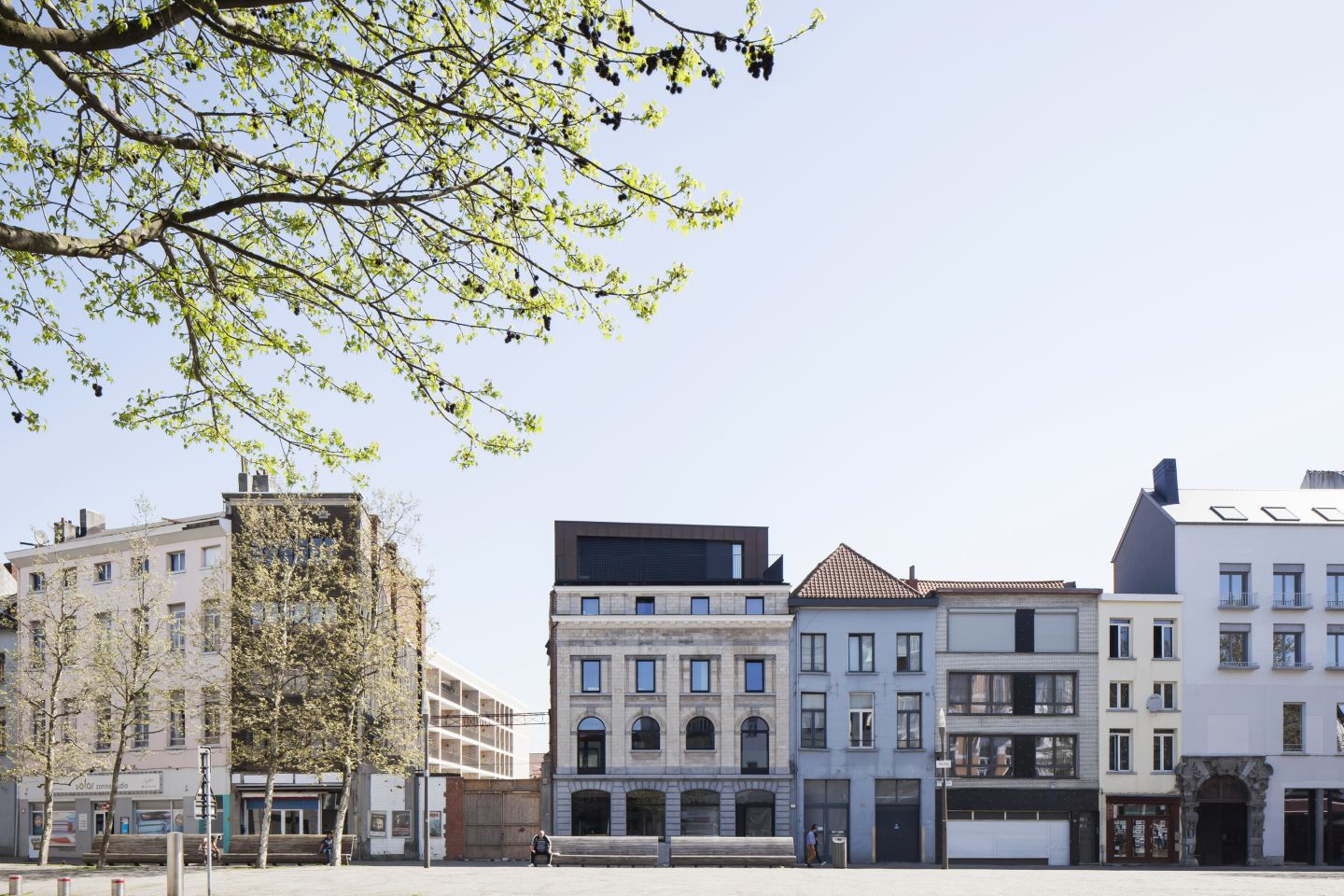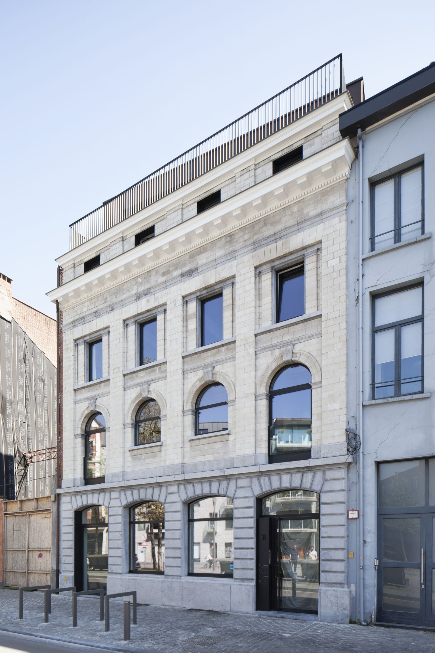 De historische voorgevel wordt integraal gerenoveerd en hersteld. De dubbele kroonlijst wordt volgens origineel model gereconstrueerd. In de blinde attiek op de derde verdieping worden - met respect voor de gevelritmering en detaillering - vier nieuwe raamopeningen geïntegreerd. Tenslotte wordt op de bovenverdieping een extra duplexruimte toegevoegd als teruggetrokken dakvolume. De buitengevels van dit dakvolume worden bekleed met geoxideerd koper en sluiten aan bij de historische gevel in lichte natuursteen. Oud en nieuw vormen een boeiend samenspel.