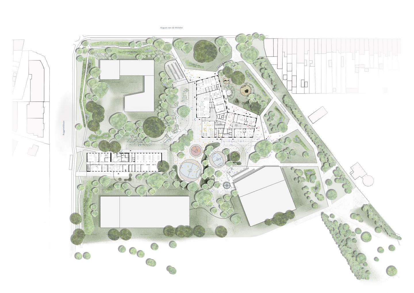 Het groene campusmodel vormt de basis voor de inplanting van gebouwen en buitenruimtes. Het park loopt door over de volledige scholencampus. De gebouwen staan in open plekken en hebben een alzijdig karakter. De voorgevels staan teruggetrokken in het groen van de parkkamer. De toegangen voor voetgangers en fietsers naar de scholen zijn comfortabele paden die aansluiten op de parklinten en de parkvoeg. Buiten de poorten, zijn die paden een onderdeel van de wandellussen en de fietsroutes doorheen het park.