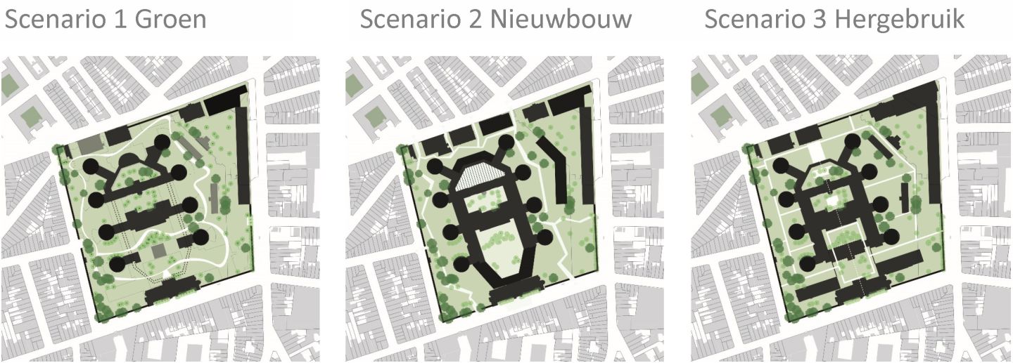 Tijdens het onderzoek werden drie scenario’s – elk vanuit een andere invalshoek - verder uitgewerkt. Naast een ruimtelijk-functionele afweging werd er ook een financiële analyse en kosten-batenanalyse van de drie scenario’s gemaakt. Uiteindelijk werd het groenscenario verder uitgewerkt als basis- en groeiscenario.