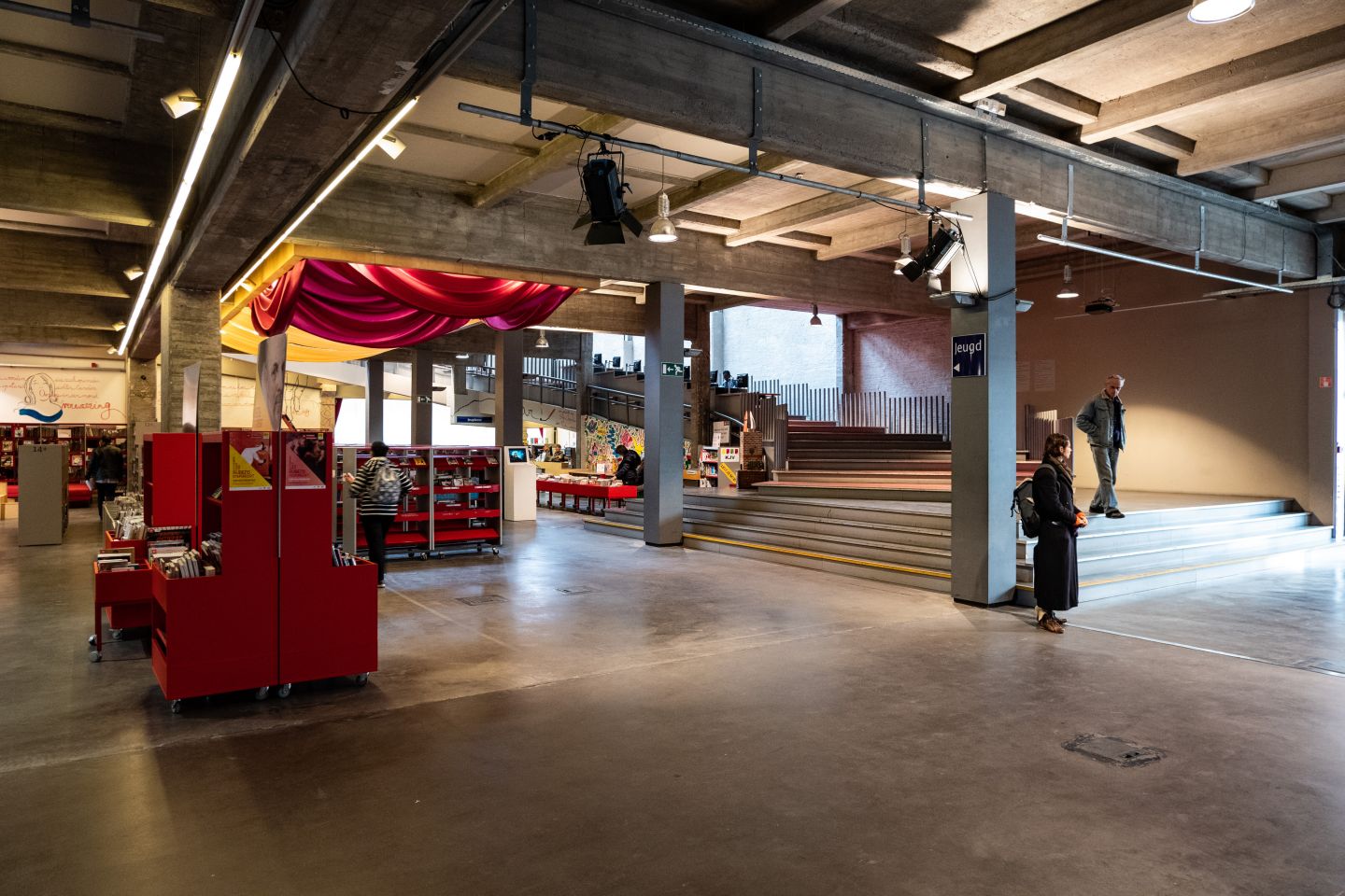 De oude garageloods (twee bouwlagen) in het binnengebied is volledig ontmanteld en omgebouwd tot de nieuwe Centrale Bibliotheek, met op het gelijkvloers een open marktconcept. Een rode kubus - met daarin een auditorium - zorgt voor een geleding van deze ruimte. Op de verdieping zijn het enorme glazen sheddak en zijn originele draagstructuur volledig hersteld. De nieuwe koepel overspant het stedelijk plein – dat ruimte biedt voor boekenrekken, of voor andere invullingen. Nieuwe kantoorgebouwen aan voor- en achterzijde van het bouwblok zijn bestemd voor een aantal diensten van de Stad Antwerpen.