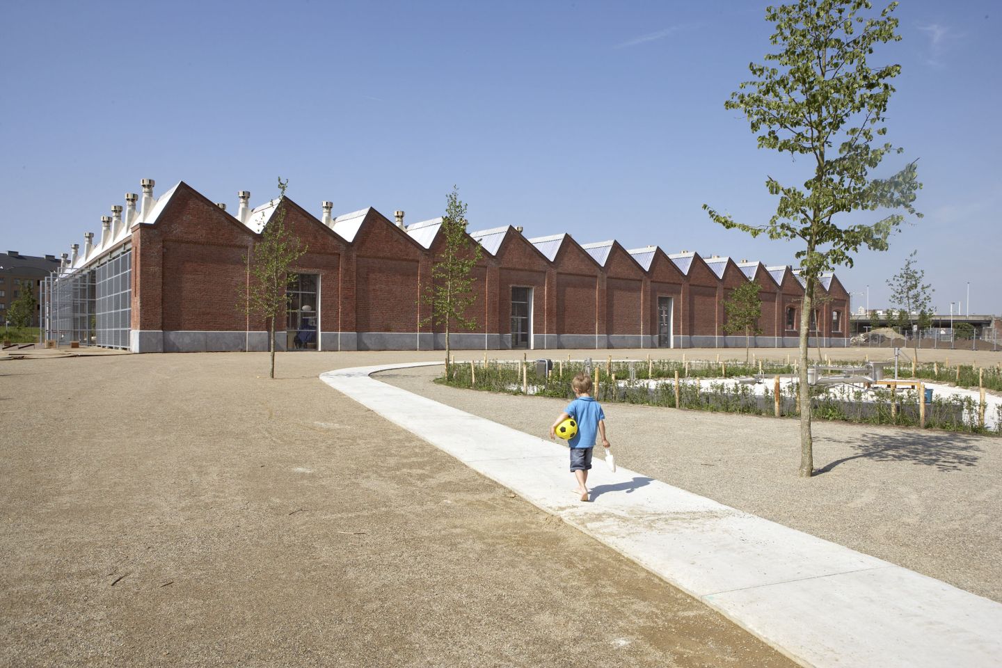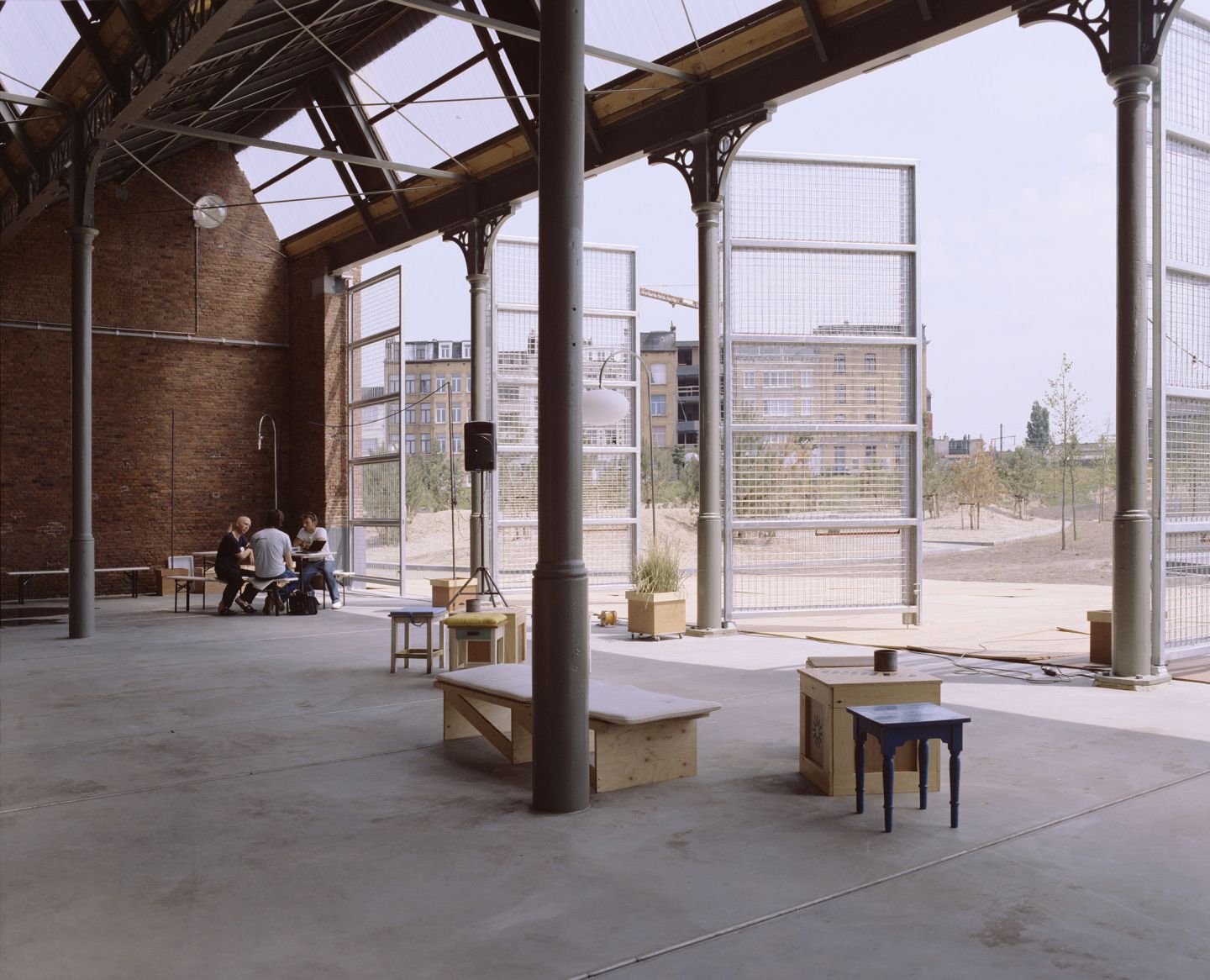 De muren aan beide kopzijden worden helemaal opengebroken, waardoor de grote overdekte binnenruimte direct verbonden wordt met het omliggende park. Ook aan de twee zijgevels zijn in de baksteenwanden kleine perforaties gemaakt, wat het contact met het park nog meer versterkt en de flexibiliteit in gebruik ten goede komt. De structurele ingrepen hebben telkens een eenvoud die bewust niet wil opvallen.